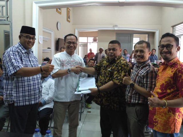 Pertemuan warga bantaran rel KA yang tergabung dalam Forum Masyarakat Bersatu Lampung ditutup dengan penyerahan berkas oleh Ketua Forum, Tengku Amanda, kepada Ketua Bravo 5, Andi Desfiandi, untuk ditelaah oleh Pos Bantuan Hukum Bravo 5 Lampung. (AS)