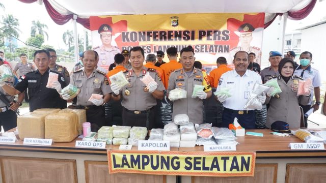 Lampunglive.com – Polres Lampung Selatan Kembali Menangkap Pengedar Narkoba. Narkoba berupa sabu seberat 21 kg, ganja 22 kg dan pil extacy sebanyak 40 ribu butir itu, digagalkan petugas polisi di area Seaport Interdection Pelabuhan penyebrangan Bakauheni, Lamsel.