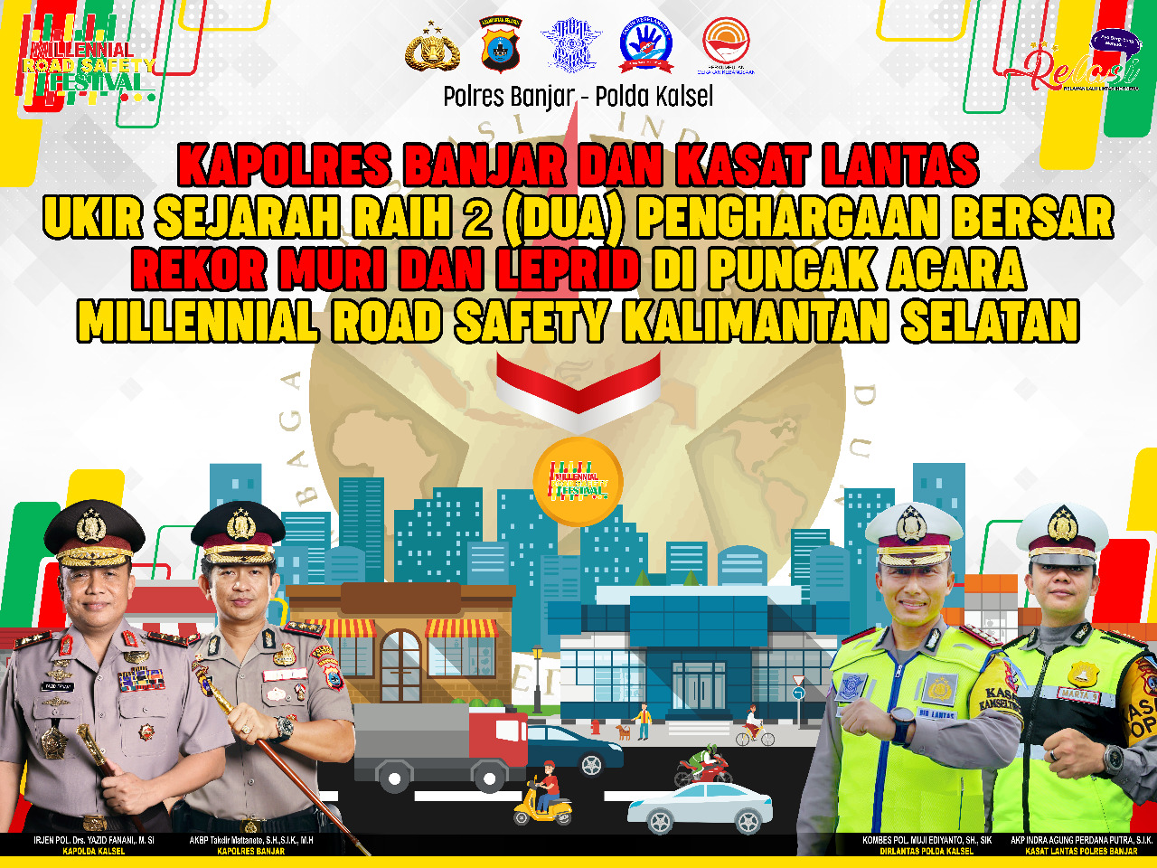 Banjarmasin – LL – Pada Puncak Millenial Road Safety Festival (MRSF) Kalsel (Kalimantan Selatan) di Kantor Gubernuran Banjarbaru yang akan dilaksanakan pada Tanggal 17 Maret 2019, Kapolres Banjar, AKBP Takdir Mattanete, SH, SIK, MH., dan Kasat Lantasnya AKP Indra A.P Putra, SIK akan mengukir Rekor Bergengsi dan Bersejarah berupa Rekor MURI dan LEPRID 2019.