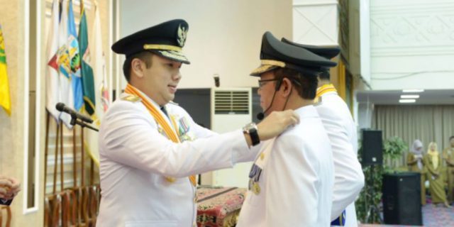 Lampunglive.com – BANDARLAMPUNG – Gubernur Lampung Muhammad Ridho Ficardo melantik pasangan Bupati dan Wakil Bupati Lampung Utara terpilih periode 2019 – 2024Agung Ilmu Mangkunegara dan Budi Utomo di Gedung Balai Keratun Lantai III Kantor Gubernur Lampung, Senin (25/3) pagi.