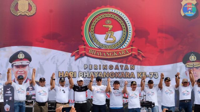 Lampunglive.com – Bandarlampung – Lampung Irjen pol Drs Purwadi Arianto Msi dan waka polda brigjen pol Rudi Setiawan SIK. SH. MH, serta seluruh PJU Polda Lampung,Komandan Brigade Infanteri 4 Marinir/BS Kolonel Ahmad Fajar, Danlanud Pangeran M.Bun Yamin, Danlanal, Walikota Lampung Bandarlampung Herman HN dan masarakat mengikuti Kegiatan Jalan Sehat yang diadakan Dalam Rangka Hari Bhyangkara Ke 73 kemudiaan dilanjutkan dengan Deklarasi Bersama Tolak Anti Kerusuhan Dan lampung damai. Minggu (23/06).