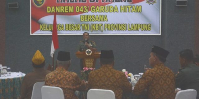 “ Kepada seluruh keluarga besar TNI di wilayah Korem 043/Gatam kami mengajak dengan kegiatan halal bihalal ini yang merupakan wadah untuk saling berkomunikasi sosial untuk memberikan pemahaman dan menyamakan persepsi tentang arti pentingnya pembinaan Teritorial kepada Keluarga Besar TNI (KBT) “ .