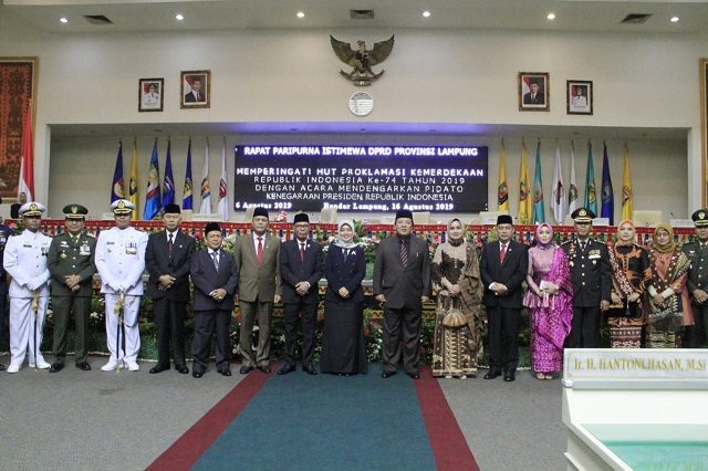 Lampunglive.com – Gubernur Provinsi Lampung Arinal Djunaidi bersama Wakil Gubernur Lampung Chusnunia Chalim menghadiri Rapat Paripurna dalam rangka Memperingati Hari Ulang Tahun (HUT) ke-74 Proklamasi Kemerdekaan Repubik Indonesia (RI) tahun 2019 dengan agenda Mendengarkan Pidato kenegaraan Presiden RI Jokow Widodo, di Gedung DPRD Provinsi Lampung, di Bandarlampung, Jumat (16/8).