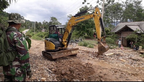 Dua alat berat tampak bekerja membersihkan material berupa batu dan tanah yang berada di penggal jalan Pekon Pardawaras dan Pekon Way Kerap, sehingga kendaraan kecil maupun sepeda motor sudah dapat melalui jalan tersebut.