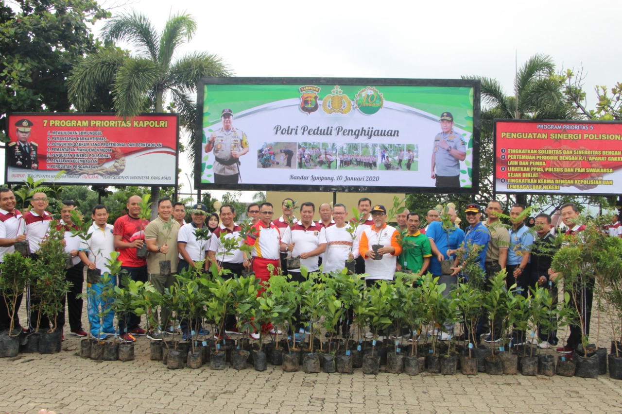Lampunglive.com – BANDARLAMPUNG-Kapolda Lampung Irjen Pol Drs. Purwadi Arianto, M.Si, Ketua Bhyangkari daerah Lampung dan Pengurus, Pejabat Utama Polda Lampung, serta seluruh Personil Polda Lampung hadir melaksanakan penanaman pohon di komplek Mako Brimob Polda Lampung Kamis, (9/1).