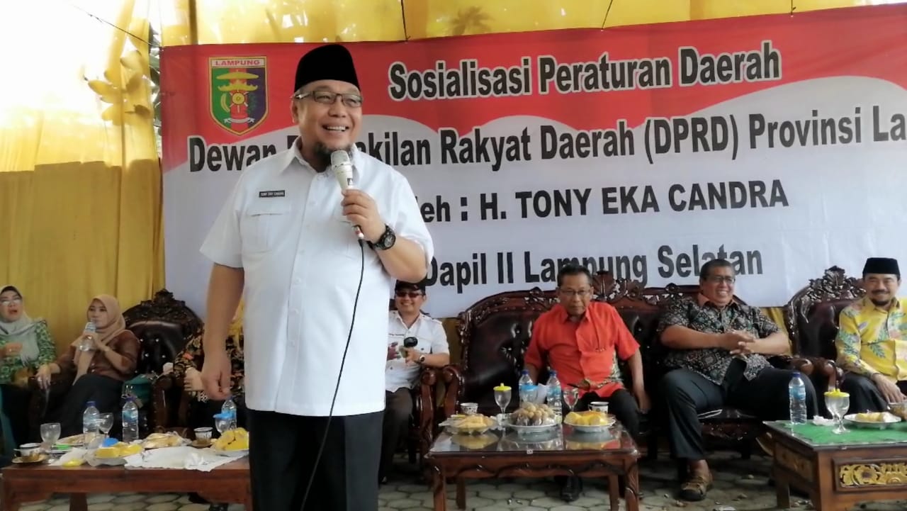 Salah satunya adalah Anggota DPRD Provinsi Lampung H. Tony Eka Candra (TEC). Politisi senior Partai Golkar Lampung ini mengajak Drs. Rusfian Effendi, MIP sebagai pemateri guna melaksanakan Sosialisasi Perda (Sosper) Provinsi Lampung Nomor 1 Tahun 2016 di Desa Gedung Agung Kecamatan Jati Agung Kabupaten Lampung Selatan, Minggu (15/3).