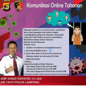Lampunglive.com – Ditengah wabah virus covid 19 yang membatasi kita untuk bepergian dan dalam rangka meningkatkan pelayanan kepada masyarakat maka Dit Tahti Polda Lampung memberikan bentuk komunikasi Online Tahanan kepada sanak keluarga.