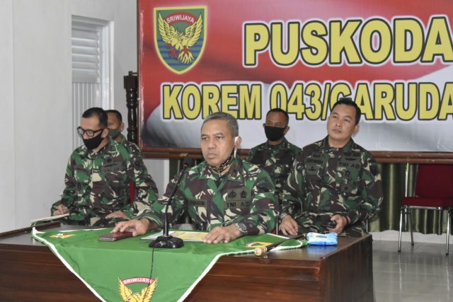 Hadir pada kegitan Vicon Webinar Tingkat Nasional Kasiren Korem 043/Gatam Kolonel Inf Tri.A, Kasi Intel Korem 043/Gatam Letkol Inf Agus.W, Kasi pers Korem 043/Gatam Letkol Inf Heriyadi W, Kasi Ops Korem 043/Gatam Letkol Inf Erwinsyah Taupan, SH, dan Pasi Ter Korem 043/Gatam Mayor Inf Asrin.