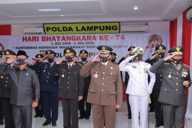 Hadir mengikuti Upacara Live Streaming peringatan HUT Bahyangkara Ke -74 Tahun 2020. Gubernur Lampung Bpk Ir H Arinal Djunaidi, Kapolda Lampung Irjen Pol Drs. Purwadi Arianto, M.SI, Waka Polda Lampung Brigjen Pol Drs Sudarsono,S.H. M.Hum. Ketua DPRD Prov. Lampung Bpk. Mingrum Gumay. Dan Brigif 4/BS Marinir Kolonel Marinir Nawawi, S.E., M.M, Danlanal Lampung Kolonel Marinir Amrul Ardiansyah, Danlanud Pangeran M.Bun Yamin Letkol Pnb. Ronal dan Pejabat utama Polda Lampung