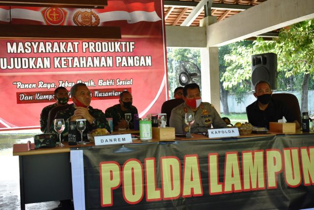 Bandar Lampung, Komandan Korem 043/Gatam Brigjen TNI Toto Jumariono S.S. M.I.Kom, kamis (09/07/2020) pukul 09.00 Wib melaksanakan kunjungan  kerja bersama Kapolda Lampung Irjen Pol Drs.Purwadi Arianto,.M.Si, untuk mengikuti  Vicon bersama Panglima TNI Marsekal Hadi Tjahjanto dan Kapolri Jenderal Idham Azis di Brugo Cotage Kelurahan Panaragan Jaya Kecamatan Tulang Bawang Tengah Kabupaten Tulang Bawang Barat Provinsi Lampung.