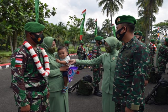 Setelah melaksanakan upacara penyambutan 12 anggota Yonif 143/TWEJ langsung disambut hangat oleh istri dan rekan-rekan Prajurit, memberikan ucapan selamat kepada rekan rekan Anggota Yonif 143/TWEJ yang telah purna tugas dengan tetap melakukan prosedur peraturan kesehatan Covid-19.