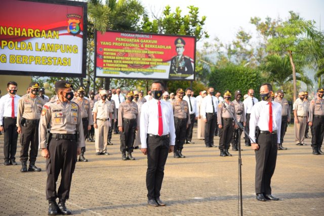 Polda Lampung, lampunglive.com — Wakapolda Lampung Brigjen Pol Drs Sudarsono SH.M,Hum., Pimpin langsung pelaksanaan apel pagi dan memberikan Penghargaan Kepada Personel atas prestasi, dedikasi, loyalitas dan tanggung jawab, dan melaksanakan tugas baik pembinaan maupun operasional tahun 2020 .