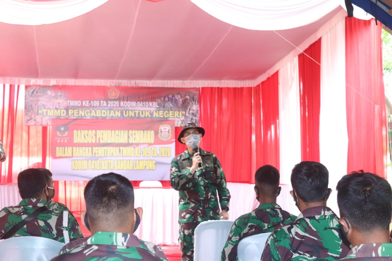 “Pada kegiatan tersebut Dandim 0410/KBL menyampaikan arahan berkenaan dengan telah selesainya kegiatan TMMD Ke-109 Tahun 2020 bertempat di Posko Jl. Udang Kelurahan Garuntang Kecamatan Bumi Waras Kota Bandar Lampung.” Rabu (21/10/2020)