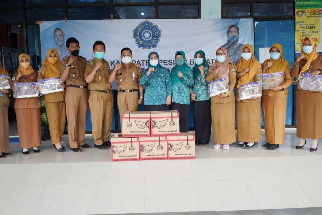 Pesisir Barat, —- Pjs. Ketua TP. PKK Kabupaten Pesisir Barat, Linda Chrisna didampingi Pjs. Bupati Pesisir Barat, Achmad Chrisna Putra dan Asisten Bidang Pemerintah dan Kesejahteraan Rakyat Audi Marpi S.Pd MM, pejabat Dinas Kesehatan serta beberapa anggota TP. PKK Kabupaten Pesisir Barat melakukan kegiatan Gerakan Bersama Memakai Masker (Gebrak Masker), Senin (02/11).