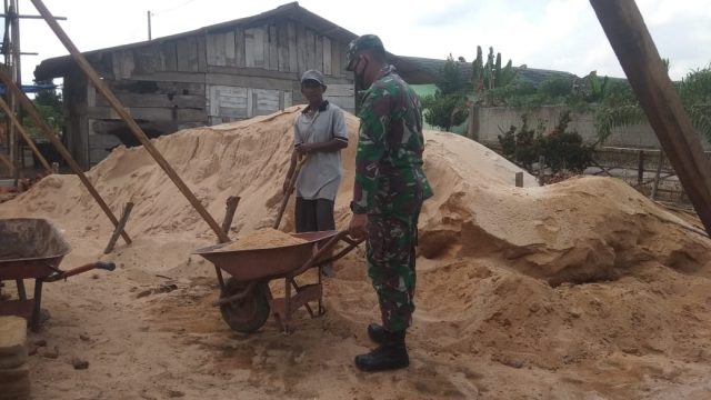 Seperti dilakukan Serda Muji yang melaksanakan gorong-royong membangun rumah milik Samet di Kampung Binaan Serda Muji.