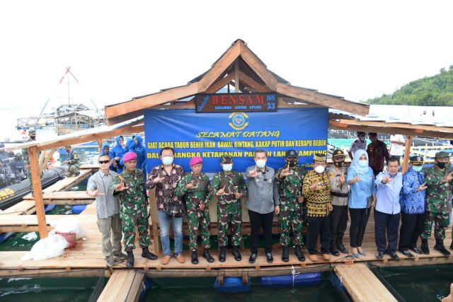 Lampunglive.com – Bupati Pesawaran H. Dendi Ramadhona K., ST., M.Tr.IP. menghadiri Kegiatan Program Ketahanan Pangan Pangkalan Angkatan Laut (Lanal) Lampung Penebaran 2000 Benih Kerapu Bebek, 1000 Benih Bawal Bintang, dan 1000 Benih Kakap Putih di Keramba Jaring Apung ( KJA ) Lanal Lampung