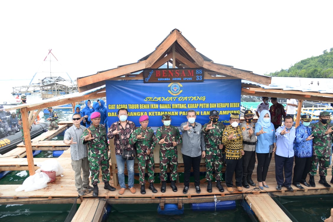 Danlanal Lampung Pimpin Program Ketahanan Pangan Dan Penebaran 2.000 Benih Kerapu Bebek, 1.000 Benih Bawal Bintang Dan 1.000 Benih Kakap Putih Di KJA Lanal Lampung