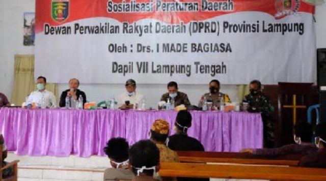 Anggota DPRD Provinsi Lampung, I Made Bagiasa melakukan Sosialisasi Peraturan (Sosper) Daerah nomor 3 tahun 2020 tentang Adaptasi Kebiasaan Baru Dalam Pencegahan dan Pengendalian Corona Virus Disease 2019 (COVID-19) di Desa Utama Jaya, Kecamatan Seputih Mataram, Lampung Tengah, Sabtu (13/2/2021).