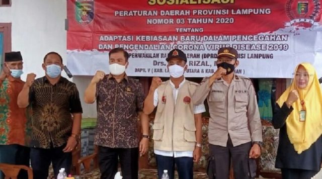 Anggota DPRD Lampung Komisi III Yose Rizal sosialisasikan Peraturan Daerah (Perda) Nomor 3 Tahun 2020 tentang Adaptasi Kebiasaan Baru Pencegahan dan Pengendalian Covid-19 di Kelurahan Tanjung Senang, Kecamatan Kotabumi Selatan, Lampung Utara, minggu 14 Februari 2021.