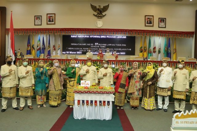 Mengawali sambutannya, Ketua DPRD Provinsi Lampung mengucapkan terimakasih atas kehadiran seluruh undangan dan menerapkan protokol kesehatan. Di HUT ke-57 Provinsi Lampung tahun ini, menurut Mingrum Gumay, menjadi peringatan HUT yang berbeda dari tahun-tahun sebelumnya karena dirayakan di tengah kondisi pandemi Covid-19 yang masih melanda.