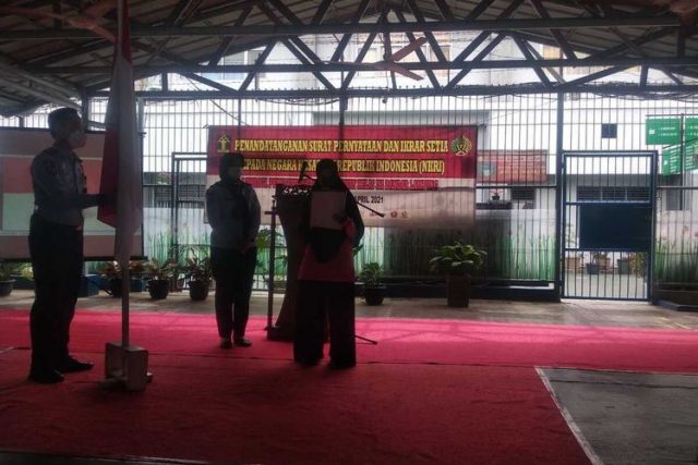 Bandar Lampung, lampunglive.com – Nurhasanah alias Nana, narapidana terorisme mengucap ikrar setia kepada NKRI di Lembaga Pemasyarakatan (Lapas) Perempuan Kelas II A Bandar Lampung, Selasa (6/4/2021).