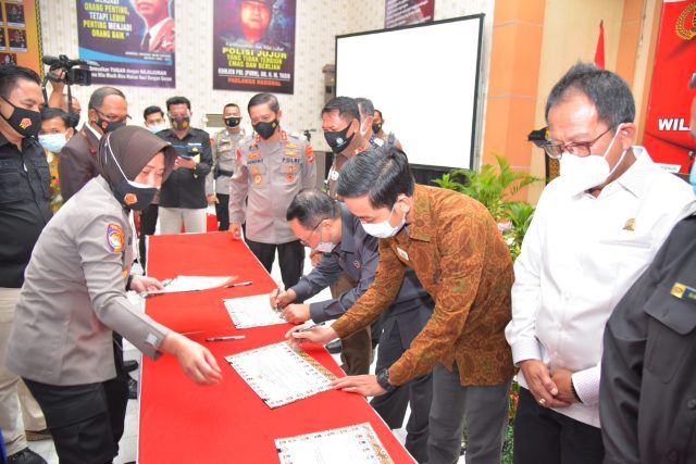 Bandarlampung – Bandarlampung – Kapolda Lampung Irjen Pol Hendro Sugiatno, didampingi Wakapolda Lampung Brigjen Pol Subiyanto dan Pejabat Utama Polda Lampung melaksanakan Pencanangan Pembangunan ZI (Zona Integritas) menuju WBK (Wilayah Bebas Korupsi)/ WBBM (Wilayah Birokrasi Bersih Melayani di Satker Polda Lampung tahun 2021.(22/04)
