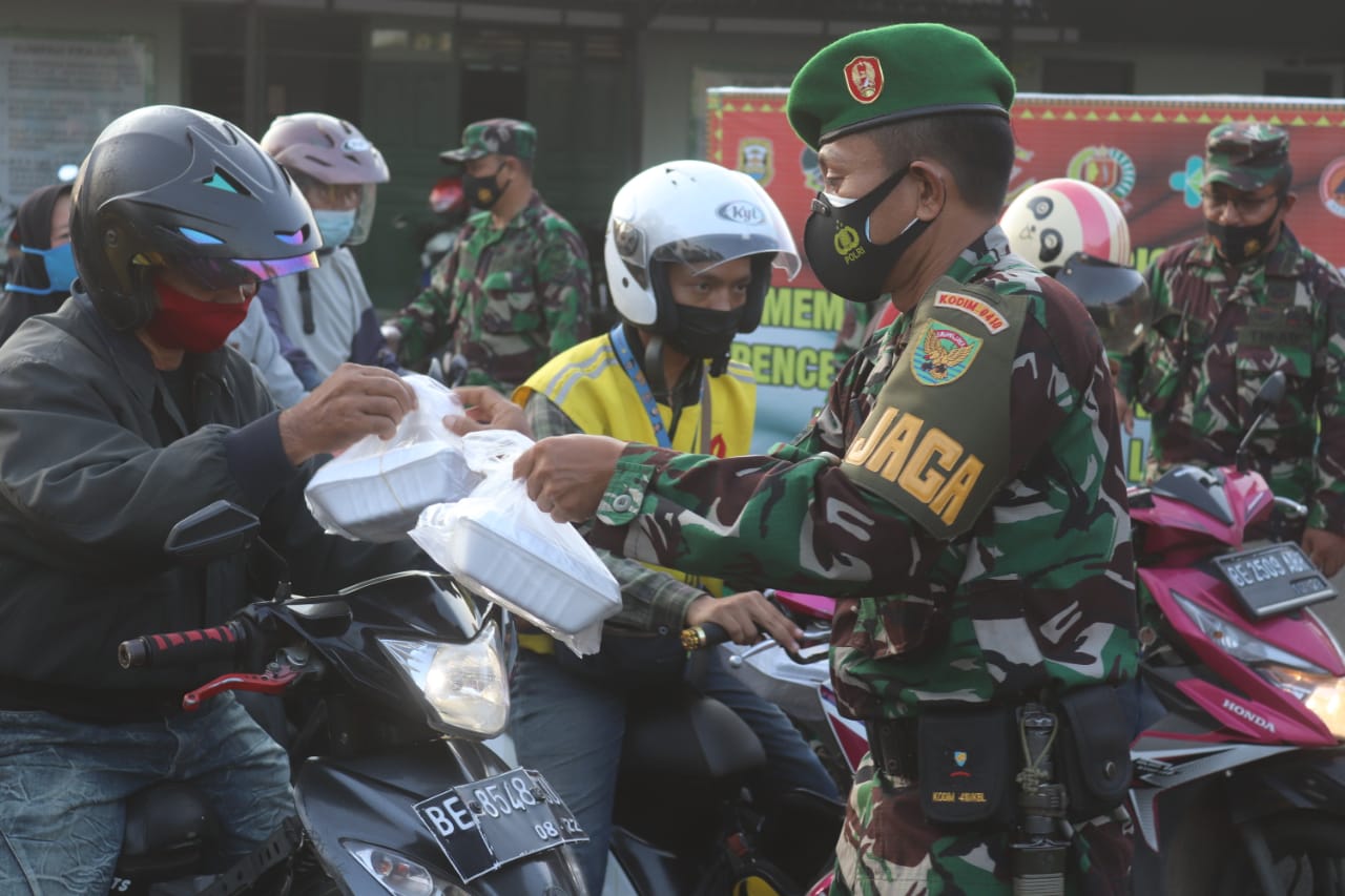 “Perwira Pengawas Kodim 0410/KBL Mayor Inf Suprapto mengatakan, dalam berbagi takjil kali ini, Kodim 0410/KBL berkolaborasi dengan Pegiat Sosial Sedekah Umat, membagikan 150 Kotak Nasi, 100 Kotak Kue dan 50 unit Masker,” ujarnya saat dikonfirmasi, Selasa (27/4/2021).