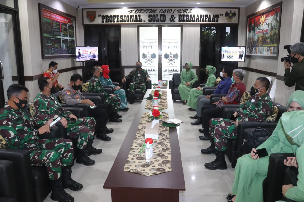 Komandan Kodim 0410/KBL Kolonel Inf Romas Herlades, S.E.,M.Si.,M.M., didampingi Ketua Persit KCK Cab. XXX Dim 0410/KBL Ny. Esa Romas Herlandes, menyambut kunjungan kerja Danrem 043/Gatam Brigjen TNI Drajad Brima Yoga, S.Ip.,M.H., dan Ketua Persit KCK Koorcab Rem 043 PD II/Swj Ny.Epie Drajad Brima Yoga bertempat di Kodim 0410/KBL Jln. Imam Bonjol Kel. Langkapura Kota Bandar Lampung. Jum’at (07/5/2021)