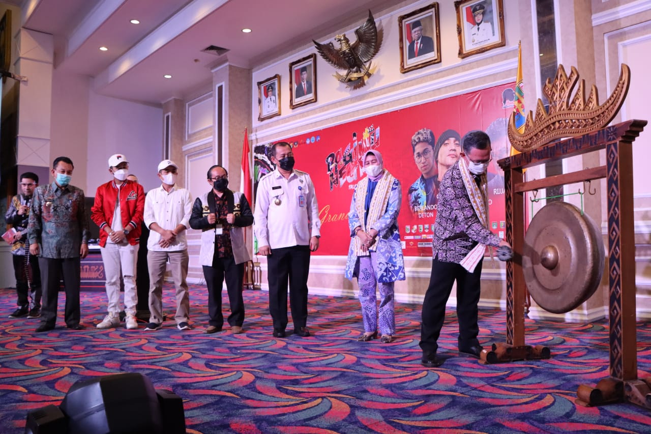 Lampunglive.com – BANDARLAMPUNG—-Gubernur Lampung Arinal Djunaidi diwakili oleh Sekretaris Daerah Provinsi Lampung Fahrizal Darminto melakukan pemukulan Gong sebagai tanda secara resmi pembukaan ajang Grand Final Talent Hunting Bagimu Negri di Balai Keratun, Komplek Perkantoran Gubernur Lampung, Bandarlampung, Kamis (03/06/2021).
