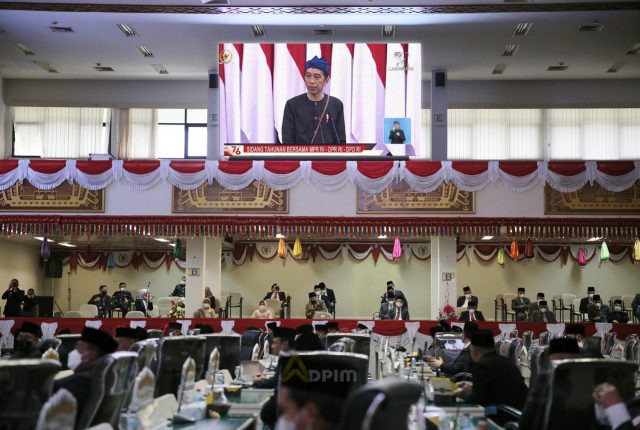 Lampunglive.com – BANDARLAMPUNG – Gubernur Lampung Arinal Djunaidi dan Wakil Gubernur Lampung Chusnunia bersama Forkopimda Provinsi Lampung, dan segenap jajaran Pemerintah Provinsi Lampung menghadiri Rapat Paripurna dalam rangka Memperingati Hari Ulang Tahun (HUT) Proklamasi Kemerdekaan Repubik Indonesia (RI) Ke-74 dengan agenda Mendengarkan Pidato kenegaraan Presiden RI Joko Widodo, di Ruang Sidang DPRD Provinsi Lampung, Bandarlampung, Senin (16/8/2021).