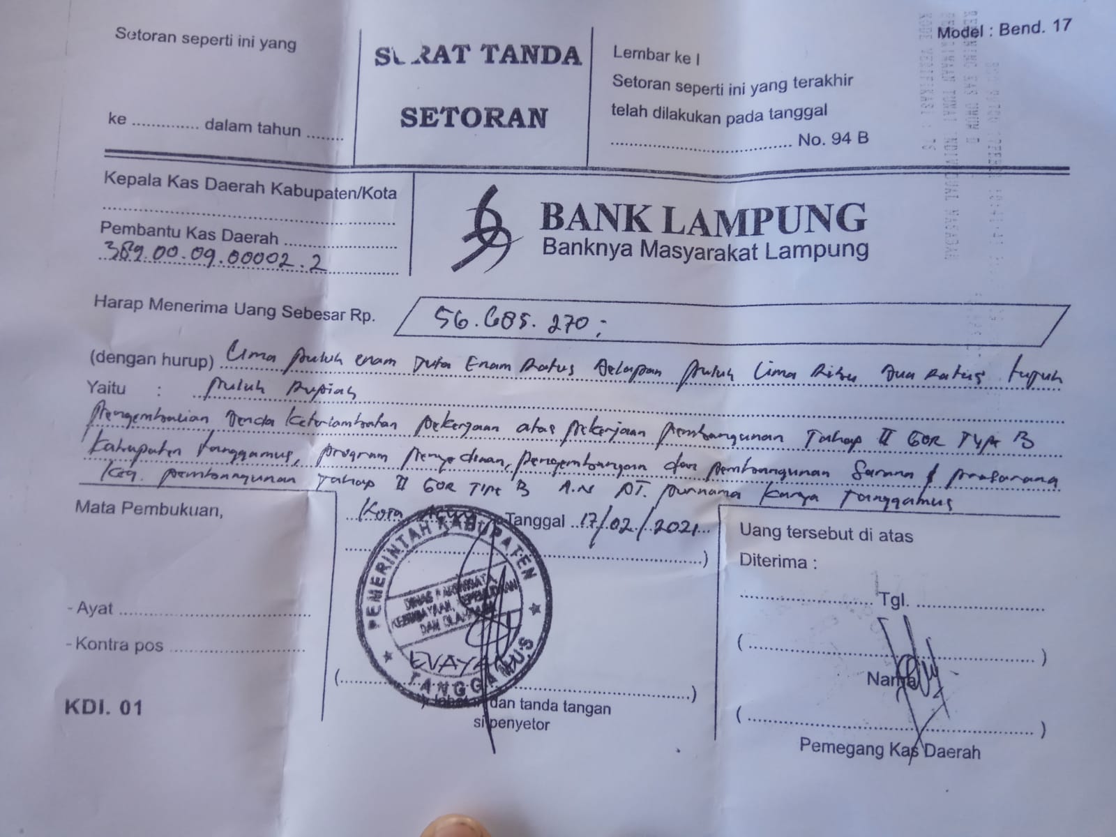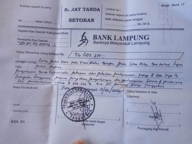 “Denda itu sudah disetorkan ke BANK Lampung kepada KAS Pemda dengan jumlah nilai Rp.3.244.730,- pada tanggal 29 Januari 2021. Penyetoran kedua bernilai Rp.56.685.270,- pada tanggal 12 Februari 2021. Maka, tim BPK menyatakan bahwa sudah selesai secara administrasi terkait temuan denda untuk pekerjaan pembangunan GOR tipe II, sehingga tidak ada temuan lagi dan sudah ditindaklanjuti,”tukasnya.