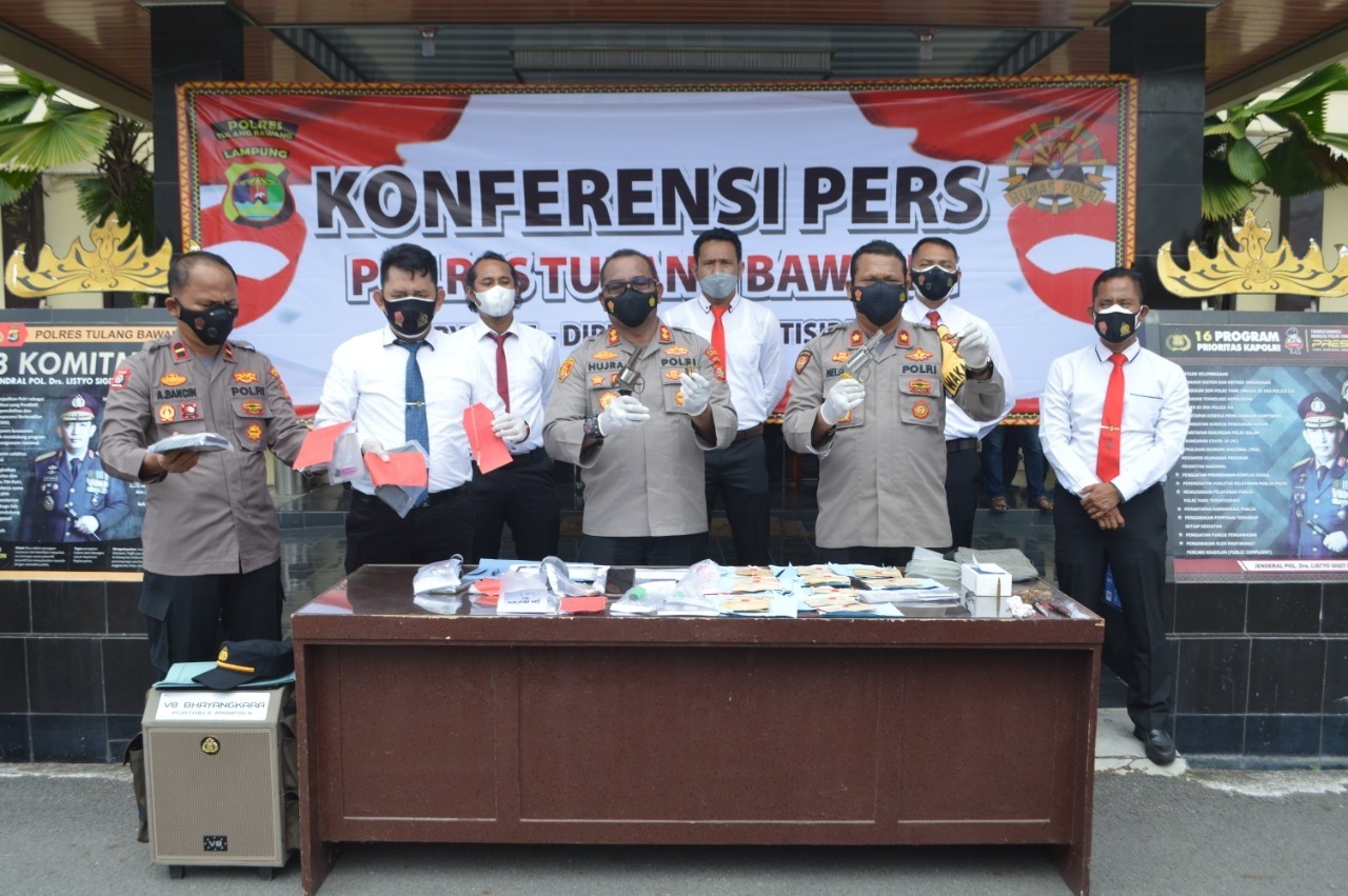“Dari 192 kasus yang telah berhasil diungkap, sebanyak 62 tersangka telah ditangkap dengan rincian 44 laki-laki, 9 perempuan, dan 9 anak-anak,” ucap Kapolres Tulang Bawang AKBP Hujra Soumena, SIK, MH, saat menggelar konferensi pers bersama dengan Wakapolres Kompol Nelson F Manik, SH, hari Senin (06/09/2021), pukul 10.40 WIB, di lapangan apel Mapolres setempat.