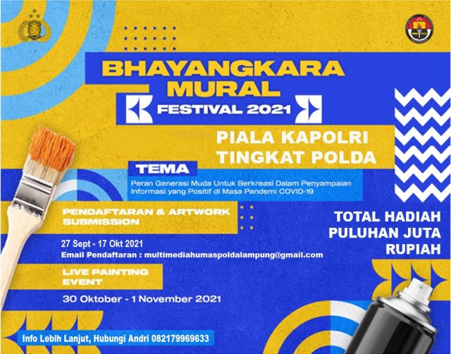 Lampunglive.com – Bandar Lampung – Polda Lampung akan menggelar Bhayangkara Mural Festival 2021 piala Kapolri dengan hadiah puluhan juta rupiah dalam rangka memberikan inspirasi semangat pergerakan dalam menyampaikan pesan positif melalui media mural.