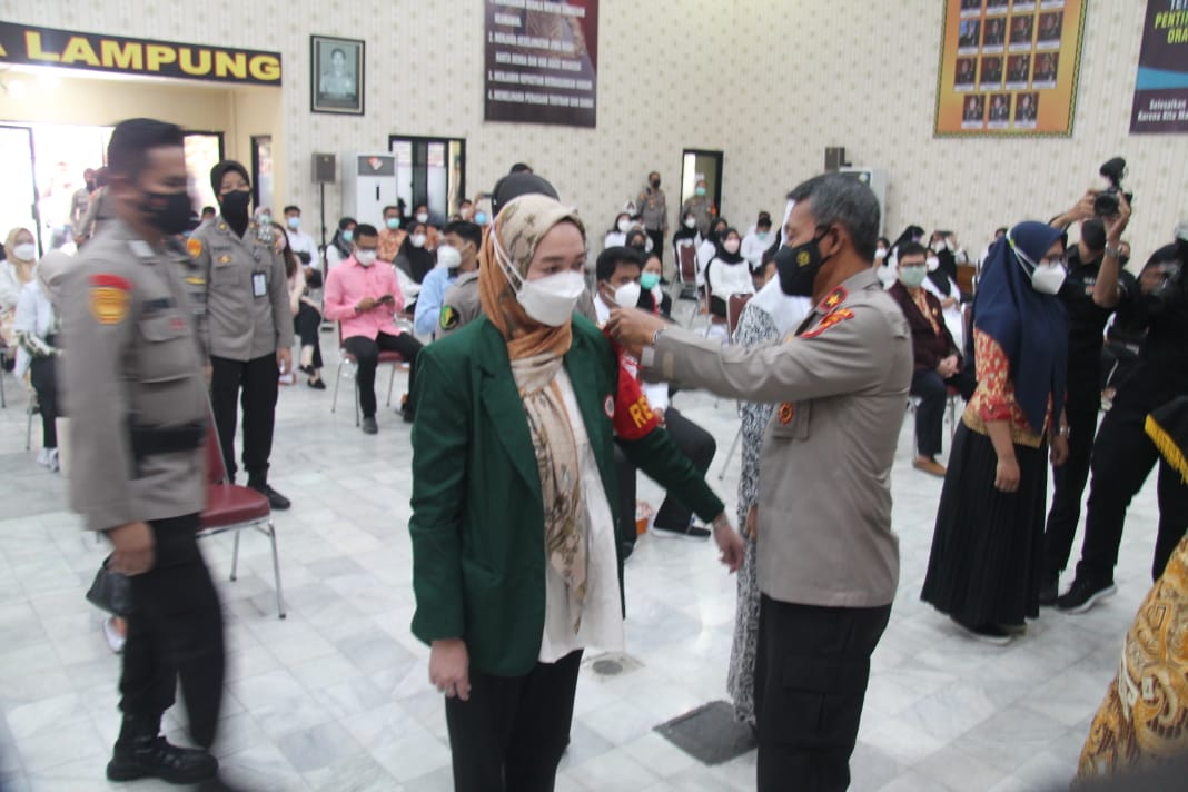Lampunglive.com – BANDAR LAMPUNG- Guna mempercepat vaksinasi nasional, Polda Lampung melantik 108 orang Tim Relawan Vaksinator Covid-19 Provinsi Lampung di Graha Wiyono Siregar (GWS) Polda Lampung, pada Jum’at (8/10) sore.