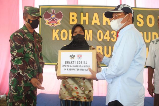 Komandan Korem 043 Garuda Hitam Brigjen TNI Drajad Brima Yoga bagikan bantuan sosial kepada masyarakat di Makoramil 426-01 Simpang Pematang, Sabtu 30 Oktober 2021.