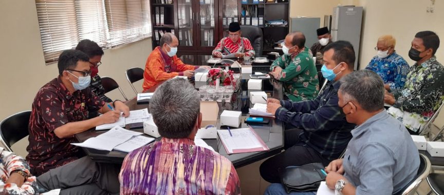 Plt Asisten Bidang Ekobang, Muhadi saat memimpin rapat koordinasi Pemantapan Pelaksanaan Operasi Pasar Tahun 2021 di ruang kerjanya.
