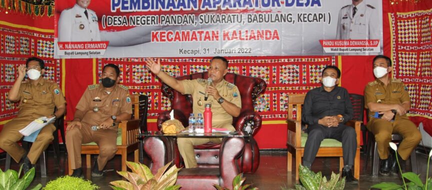 Lampunglive.com – KALIANDA–Setelah membuka secara resmi acara musrembangcam yang diselenggarakan di lapangan desa Sukaratu kecamatan Kalianda, Bupati Lampung Selatan Hj. Nanang Ermanto memberikan pembinaan kepada aparatur desa setempat di Balai Desa Kecapi, Senin (31/01/2022).