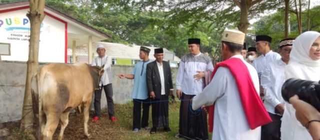 Penyerahan hewan qurban tersebut diserahkan secara simbolis oleh Bupati Lampung Selatan H.Nanang Ermanto usai melaksanakan sholat Idul Adha berjamaah, dengan didampingi Sekretaris Daerah Lampung Selatan Thamrin S.Sos. M.M dan jajaran pejabat Pemkab Lampung Selatan di halaman masjid Agung Kalianda.
