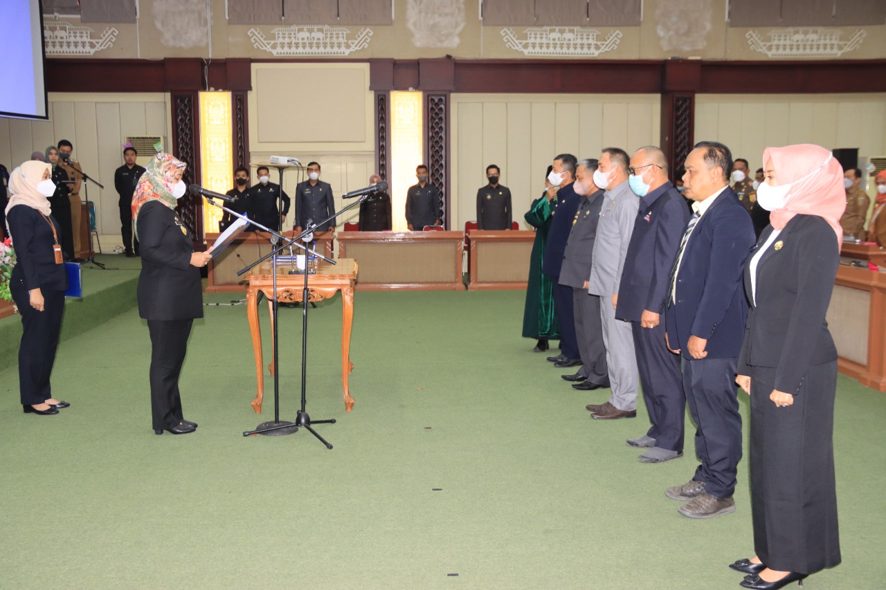 Bandar Lampung — Wakil Gubernur Lampung Chusnunia melantik dan mengambil sumpah jabatan Pejabat Pimpinan Tinggi Pratama dan Pejabat Administrasi di Lingkungan Pemerintah Provinsi Lampung, di Gedung Pusiban, Selasa (12/7).