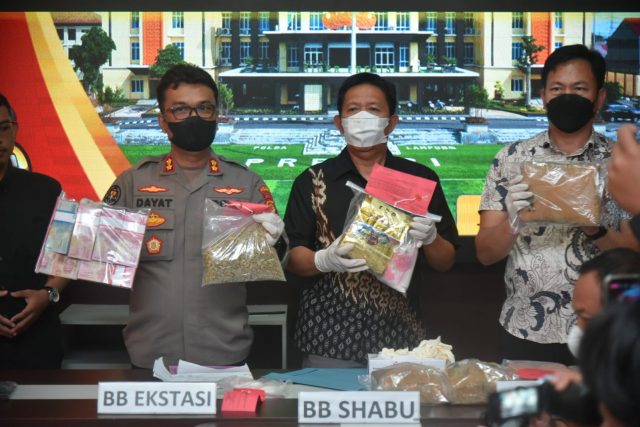 Hal tersebut disampaikan Kasubdit 1 Ditresnarkoba AKBP. Ujang Suprianto didampingi Kasubbid Penmas Bidhumas Polda AKBP Rahmad Hidayat dan Kabagbinops Ditresnarkoba AKBP. Riza Pahlevi, saat melakukan Konferensi pers di Aula gedung Ditresnarkoba Mapolda Lampung, Jumat (2/9/2022).