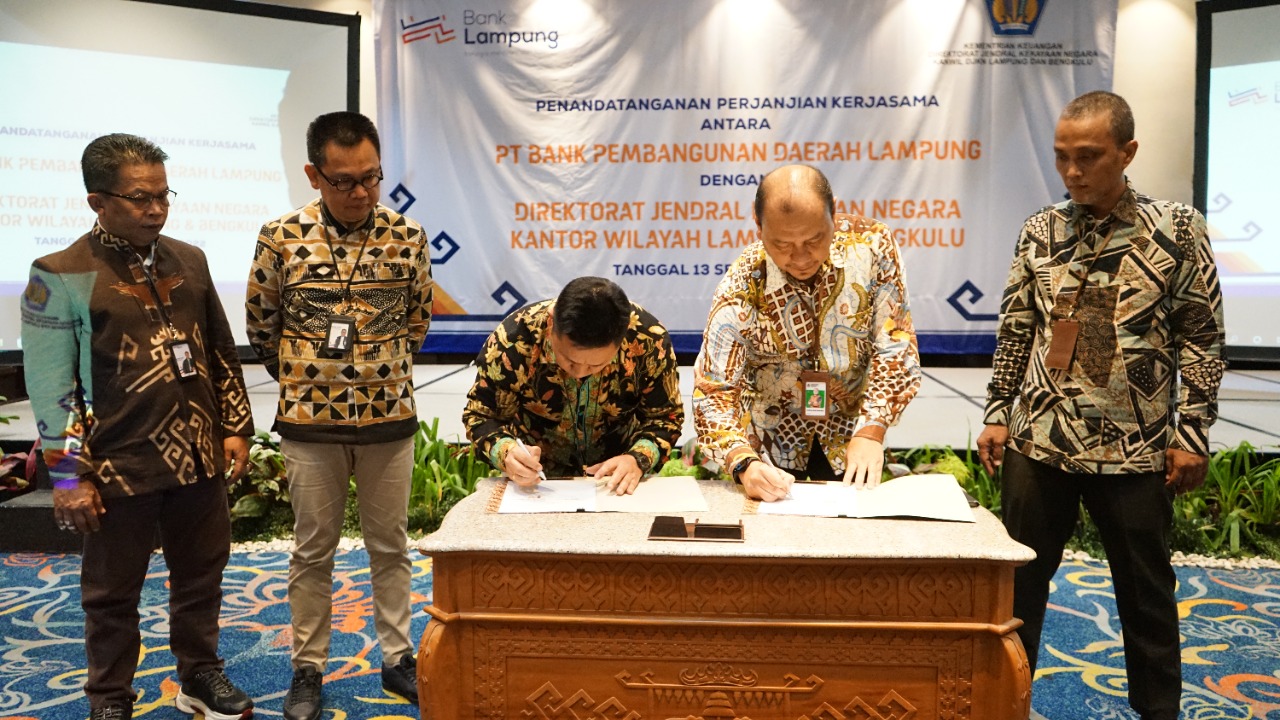 Penandatanganan nota kesepahaman dilakukan Direktur Utama Bank Lampung Presley Hutabarat dan Kepala Kanwil DJKN Lampung dan Bengkulu Dudung Rudi Hendratna, Selasa (13/9/2022) di Hotel Sheraton yang juga dihadiri oleh Kepala KPKNL Bandar Lampung Haryanto, KPKNL Metro, Kepala-kepala Divisi Bank Lampung dan seluruh Pimpinan Kantor Operasional Bank Lampung.