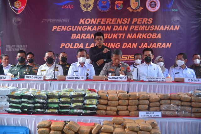 Dia melanjutkan ratusan kilogram narkotika berbagai jenis itu dilakukan penyitaan oleh jajaran Dit Resnarkoba Polda Lampung mulai di penyeberangan Pelabuhan Bakauheni. Lampung Selatan, tempat kos-kosan, wisma, rumah makan, hingga di sebuah ladang di Provinsi Aceh.