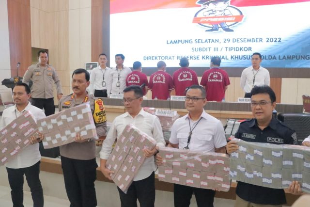 Polda Lampung – Direktorat Kriminal Khusus Polda Lampung Lakukan Konferensi Pers Atas Keberhasil Ungkap Tindak Pidana Korupsi Pekerjaan Kontruksi Preservasi Rekontruksi Jalan Prof Ir Sutami -Sribowono -Sp Sribowono TA 2018-2019. Di GSG Polda Lampung, Lampung Selatan. Kamis (29/12/22).
