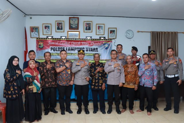 Kotabumi, Nara sumber pemeliharaan Kamtibmas (Harkamtibmas) dari Polres Lampung Utara yang di pimpin Kapolres AKBP Kurniawan Ismail S.H., S.I.K., M.I.K., kali ini menyambangi warga desa Abung Jayo Kecamatan Abung Selatan melalui program “Jumat Curhat”.