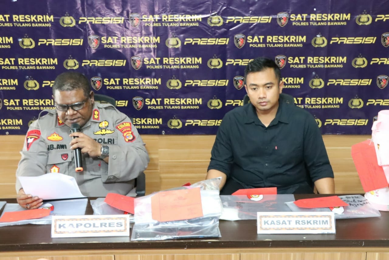 “Hari ini kami menggelar konferensi pers terkait keberhasilan ungkap kasus pembunuhan berencana yang dilakukan oleh seorang suami kepada istrinya sendiri. Pelaku ditangkap hari Kamis (30/03/2023), sekitar pukul 14.30 WIB, saat sedang berada di rumah mertuanya di Kampung Tri Dharma Wira Jaya, Kecamatan Banjar Agung,” kata Kapolres Tulang Bawang, AKBP Jibrael Bata Awi, SIK, yang didampingi Kasat Reskrim, AKP Wido Dwi Arifiya Zaen, SIK, MH, dan PS. Kanit Resum, Aiptu Robert H Purba, SH, MH, hari Jum’at (31/03/2023), sekitar pukul 13.30 WIB, di aula Mapolres setempat.