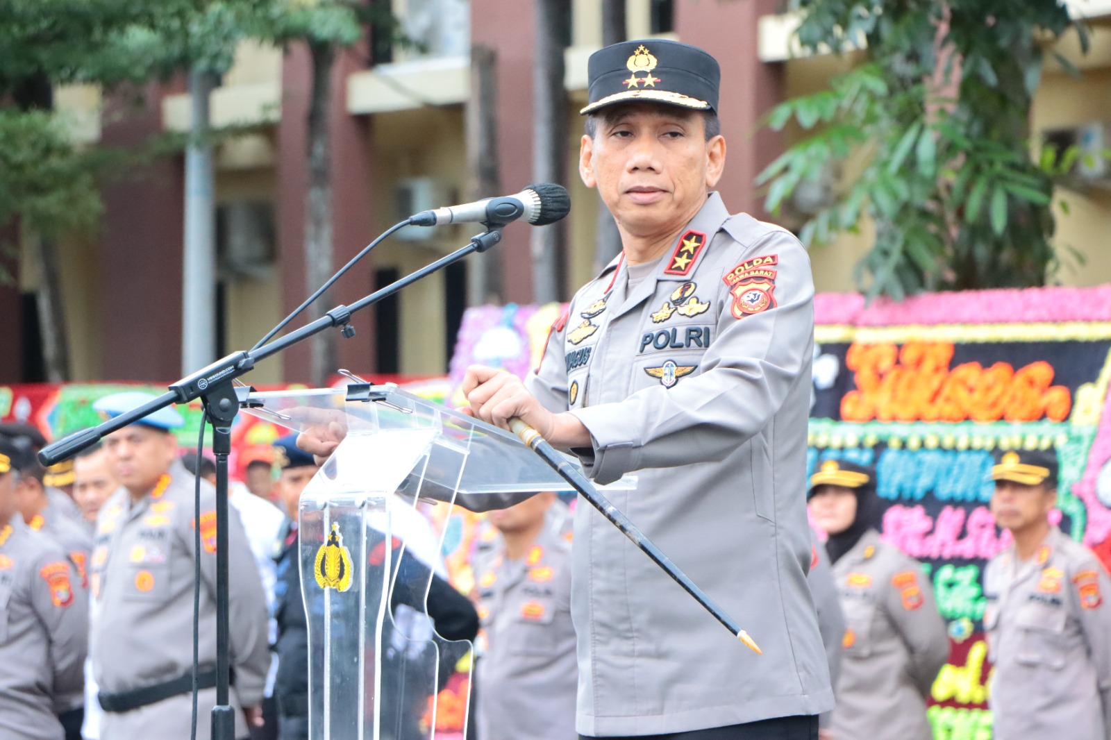 Polda Lampung – Irjen Pol Ahmad Wiyagus memgambil Apel pagi sebelum kegiatan rangkaian Sertijab dengan Kapolda Lampung yang baru Irjen Pol Helmi Santika di Mapolda Lampung, Lampung Selatan, Senin (10/04/23).