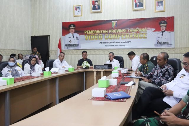 Bandar Lampung — Sekretaris Daerah Provinsi Lampung, Fahrizal Darminto, mengikuti Rapat Pengendalian Inflasi Daerah secara daring, di Ruang Command Center Lt.II Dinas Kominfotik Provinsi Lampung, Rabu (3/5/23).