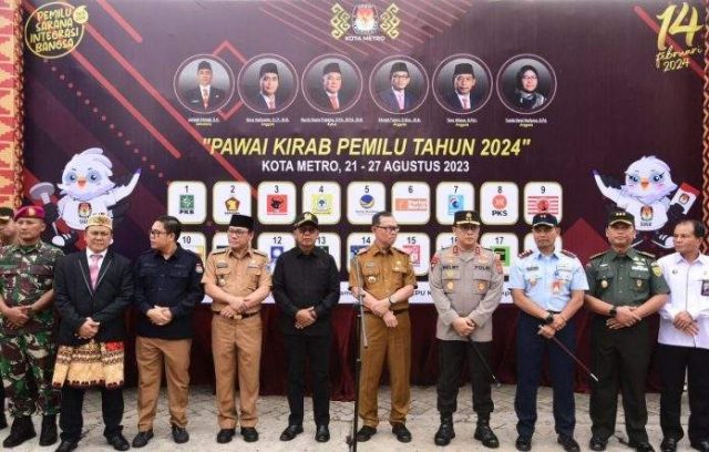 Ketua DPRD Lampung Mingrum Gumay SH., MH menghadiri kirab Pemilu Tahun 2024 dan Deklarasi Pemilu Sebagai Sarana Integrasi Bangsa yang berlangsung di Wisma Haji Al-Khairiyah Kota Metro, Senin (21/08/2023).