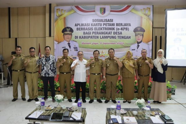 Lampung Tengah — Gubernur Lampung diwakili oleh Asisten Perekonomian dan Pembangunan Kusnardi, membuka kegiatan sosialisasi penggunaan aplikasi Kartu Petani Berjaya Berbasis Elektronik (e-KPB) kepada perangkat desa di Kabupaten Lampung Tengah, bertempat di Hotel BBC Bandar Jaya, Selasa (05/09/2023).