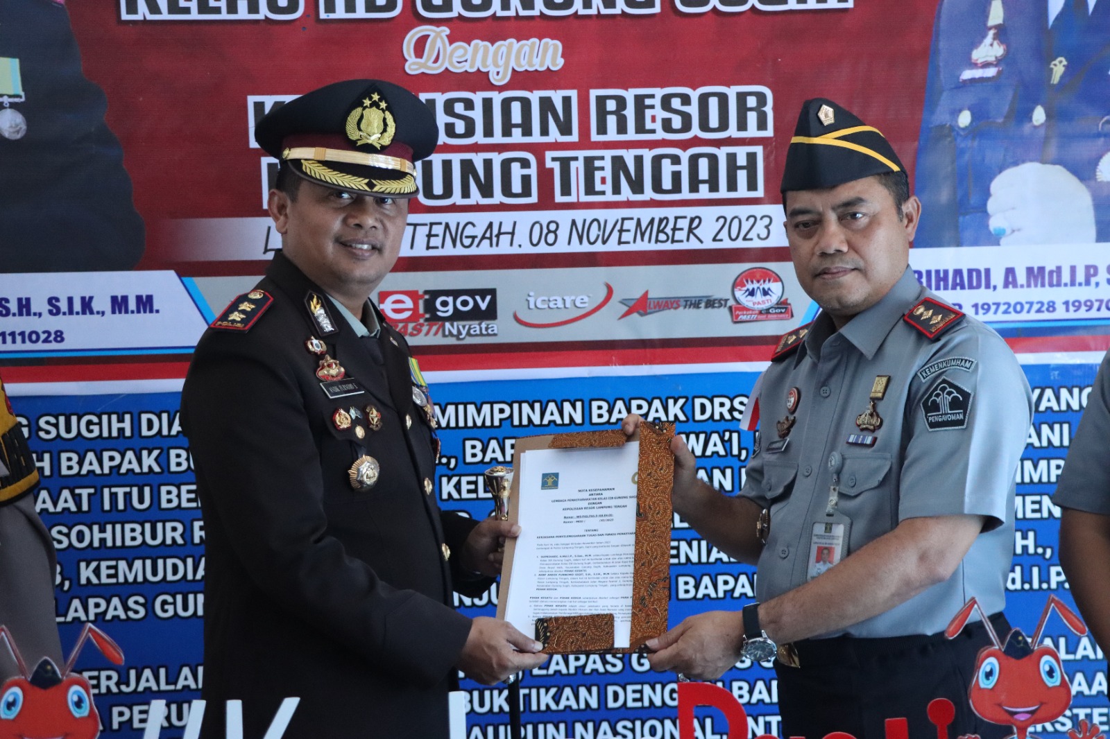 Jajaran Polres Lampung Tengah, Polda Lampung dan Lembaga Pemasyarakatan (Lapas) kelas II B Gunung Sugih mengadakan penandatanganan perjanjian kerjasama, bertempat di aula Lapas setempat, Rabu (8/11/23).